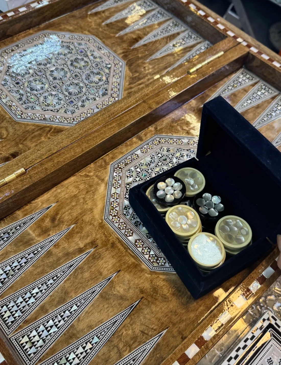 A maze of winding alleys, color, and chaos. Gold, lanterns, scarves, and things you didn’t know you needed until you touched them. Remember to bargain hard. It’s part of the culture. My purchase… this beautiful backgammon set.